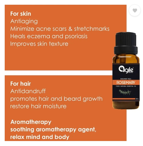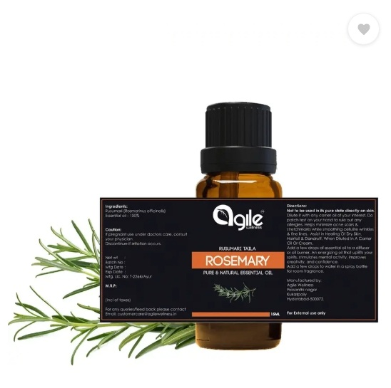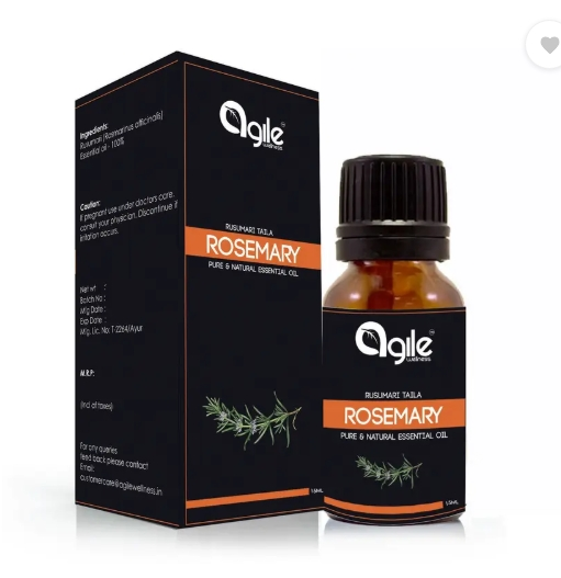 Face & Skin Care : Has anti-bacterial and inflammatory properties. It is ideal for acne scar, blemish, pimple, black-head treatment, dark circle under eye glow. Hair Care: Antidandruff, stimulates follicles hence promote hair re-growth and prevent premature greying. Aromatherapy: An energizing oil that uplifts your spirits, stimulates mental activity, improves creativity, and confidence. Add few drops of this essential oil into a diffuser, humidifier, burner or the lamp to get the best calming, soothing scented fragrance for relaxation good and positive vibes for chakras yoga and meditation , insomnia Joint and muscle pain relief. Safety usage tip: Not to be used in its pure state directly on skin. Dilute it with any carrier oil/cream/lotion of your interest. Do patch test on your hand to rule out any allergies.Sales Package : One dropper bottlePack of : 1Brand : Agile WellnessModel Name : Rosemary Essential OilQuantity : 15 mlIdeal For : Men & WomenOrganic : NoFragrance : RosemaryProfessional Care : YesApplication Area : AllSkin Type : All Skin TypesMaximum Shelf Life : 36 MonthsContainer Type : BottleNet Quantity : 15 mlKey FeaturesFor skin: Anti-aging, Anti-acne, reduces stretch marks, heals eczema For hair: Antidandruff, promotes hair and beard growth, restore hair moisture, Aromatherapy.